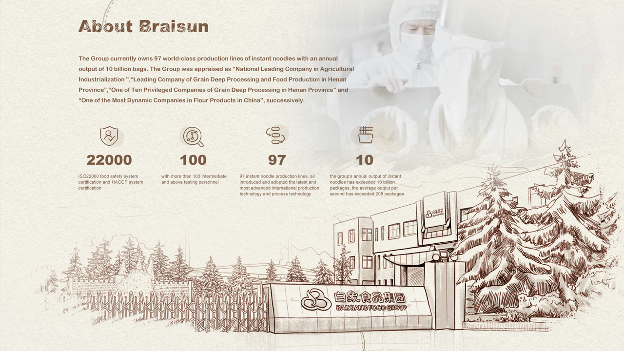 白象食品股份有限公司正式創(chuàng)建于1997年,是一家以生產(chǎn)銷(xiāo)售優(yōu)質(zhì)面制品為主、以提升人民美好生活為宗旨的綜合性食品企業(yè)。白象食品已在河南、河北、山東、四川、吉林、山西等10個(gè)省布局12個(gè)優(yōu)質(zhì)面制品生產(chǎn)基地,旗下設(shè)有分子公司20余家。其先后獲評(píng)“農(nóng)業(yè)產(chǎn)業(yè)化國(guó)家重點(diǎn)龍頭企業(yè)”、“全國(guó)主食加工業(yè)示范企業(yè)”、“中國(guó)面制品最具活力企業(yè)之一”、“河南省糧食深加工和食品生產(chǎn)龍頭企業(yè)”等榮譽(yù)。
